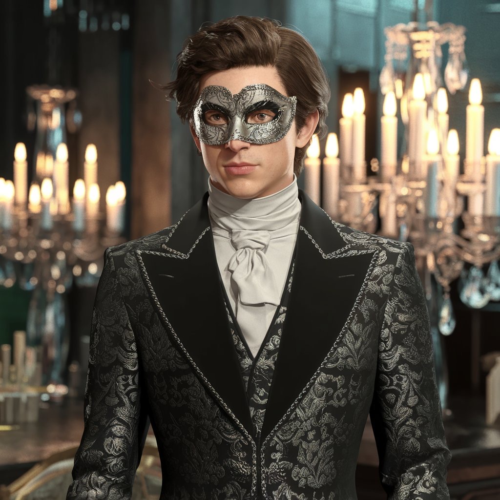 His dark, tousled curls framing an intricatedly crafted black and white mask that conceals his eyes but do little to hide the light stubble along his chiseled jawline.