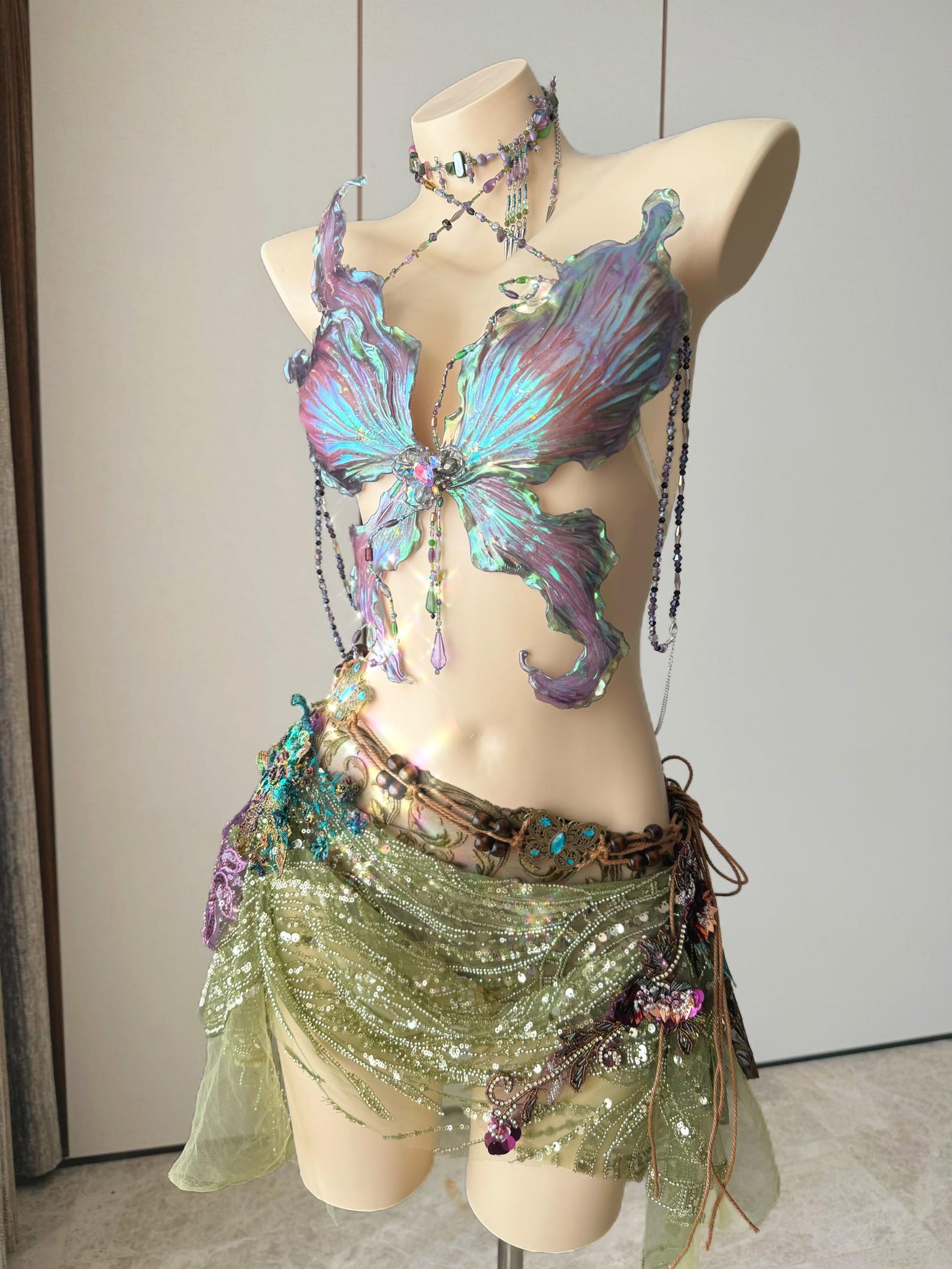 While not familiar with the song, Garrett does appreciate the performance. He sips from his glass but his attention is brought to the fairy in front of him. When he looks down at his suit he smirks. "What? This old thing?" He lightly dusts off the sleeve before gestures toward her outfit. "I like your butterfly. Or at least I think it's a butterfly. Regardless it's a very nice top."