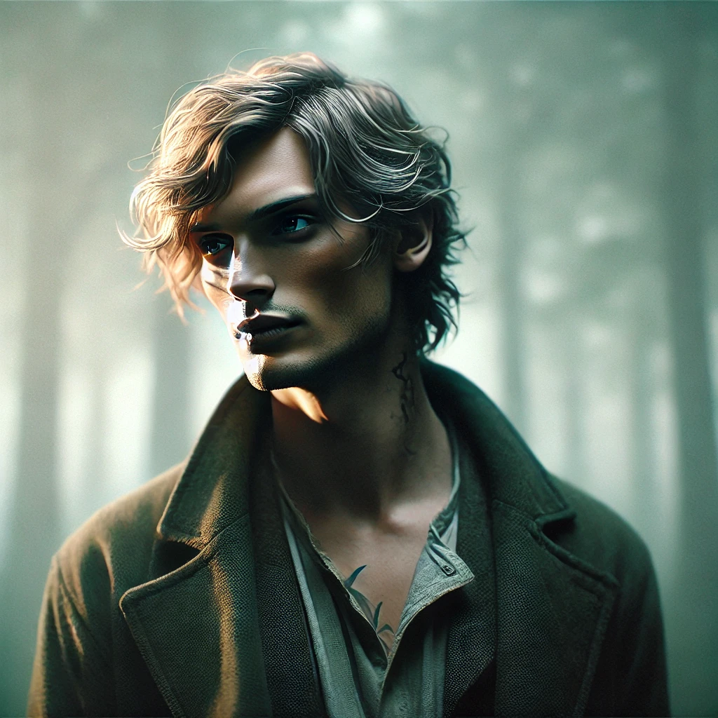 He prefers a polished but understated wardrobe: tailored black coats, fitted shirts, and boots with a slight heel. He often layers textures—wool, leather, and linen. He wears a silver earring, a silver nose ring, and a silver ring on his pinky. There are many tattoos on him. Some are hidden in clothes.