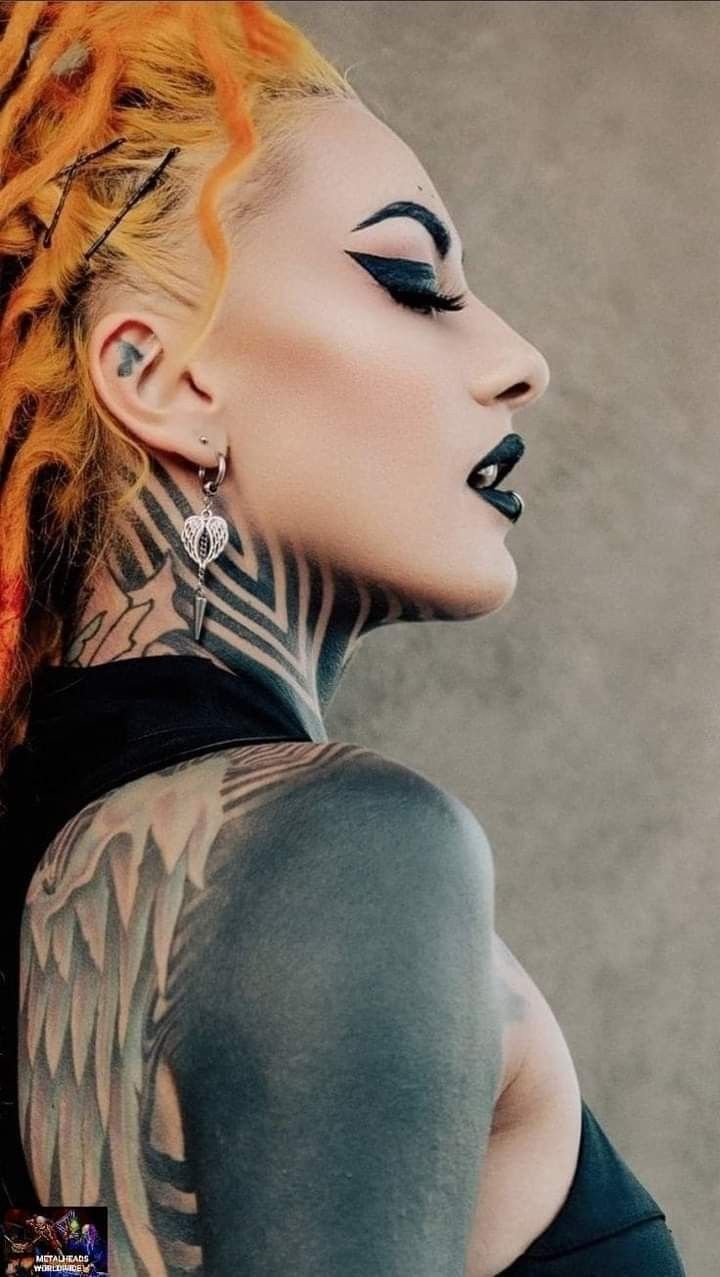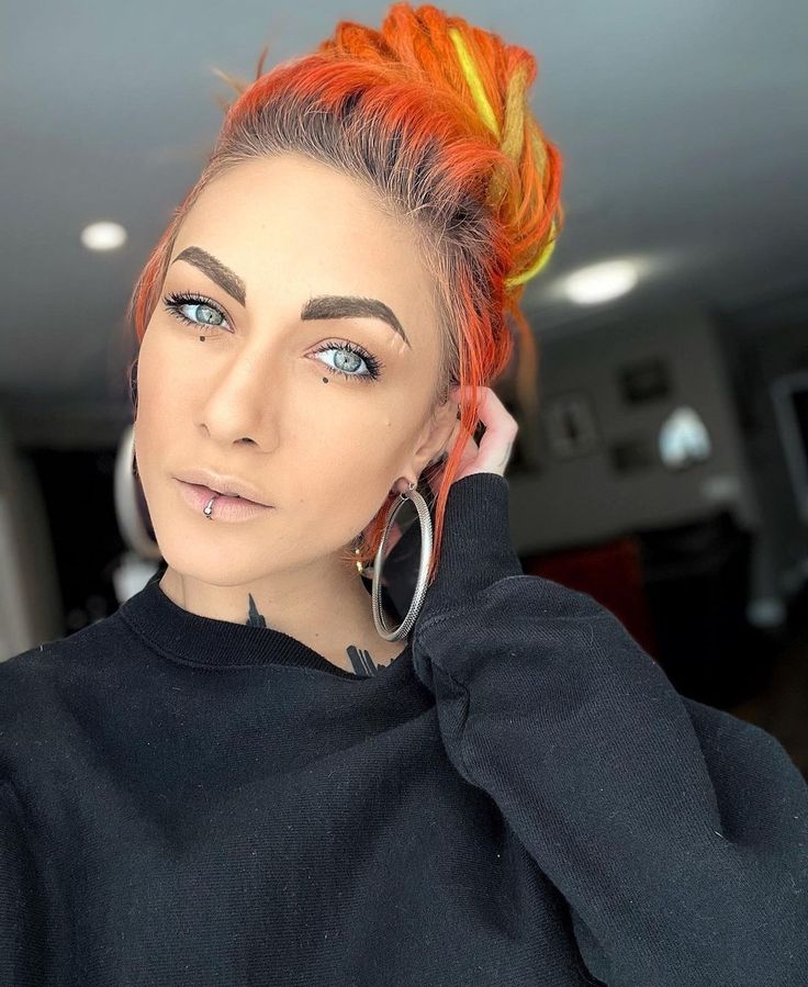 Rune is a tall, fair complected woman heavily inked in bright colors. Her hair is long and colorful, dyed wool locs falling to her lower back in bright orange this week. Everything about her is vibrant, from her green-leaning hazel eyes that shift blue on cloudy days, to her ink (heavily based in cartoon characters, fairy tale, and Alice in Wonderland imagery). One sleeve has been blacked out from shoulder to wrist. She has several piercings in lip, tongue, and nose—still others have been removed. A couple of scars in one eyebrow hint perhaps not always delicately.